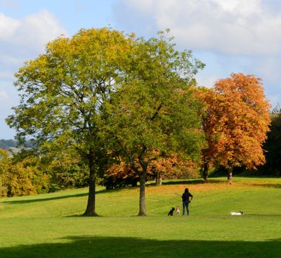 Visitors can access the park through multiple entry points, with mown pathways connecting different areas and dog waste bins placed at regular intervals.