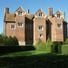 Beckley Park is a red brick manor house near Oxford surrounded by three concentric moats with projecting gabled towers. The building sits on a central island with formal gardens that shape the overall character of the entire property.