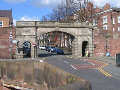 The structure connects Lower Bridge Street to the Old Dee Bridge, forming an essential part of Chester's city walls transportation network.
