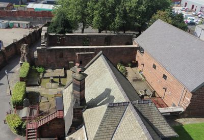 Birkenhead Priory is a medieval monastery in Wirral with stone structures including a chapter house and St Mary's Tower that overlook the River Mersey and Liverpool waterfront. The site contains remains that reflect its former monastic layout and function.