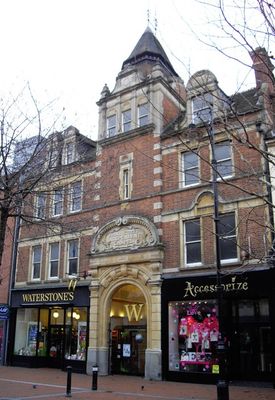 The chapel structure now functions as a Waterstone's bookshop, with modern glass-roofed conservatory connecting the frontage building to the main chapel space.