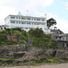 The white hotel building stands on its own tidal island, featuring geometric lines and large windows that overlook the Devon coastline and surrounding beaches.