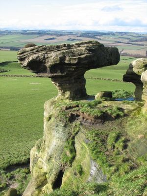 The Bunnet Stane stands as a sandstone formation with a wide table-like upper section balanced on a narrow supporting column near West Lomond.