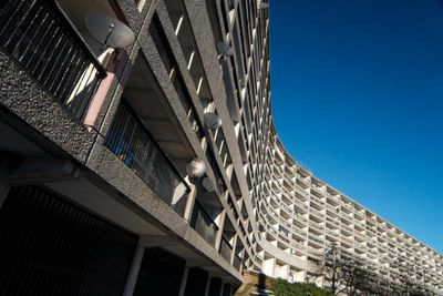 The elongated ten-story concrete structure contains 212 flats with private and public access balconies stretching across the Kirkgate area of Edinburgh.