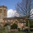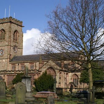 The Church of St Mary the Virgin features a four-staged tower with diagonal buttresses, ornate clock faces, and gargoyles built from pink and red Runcorn sandstone.