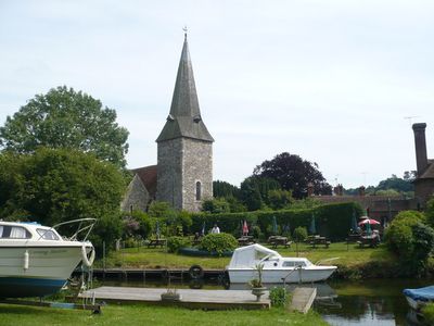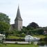 The Church of St Mary the Virgin features a combination of ragstone, flint, and brick walls, with a west tower topped by a shingled broach spire.