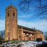 The red sandstone church features a five-bay nave, three-bay chancel, and an 86-foot tower with an embattled parapet and pyramidal roof.
