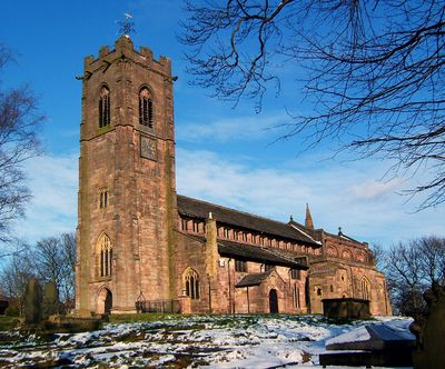 The construction of the current building began in 1450, with the tower added by the Earl of Derby in 1500, displaying his arms on its east side.