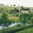 Wharram Percy is a deserted medieval village in the Yorkshire Wolds, England, where the ruins of St Martin's Church stand among visible outlines of former houses. A millpond lies in the valley bottom, surrounded by rolling hills and pastureland.