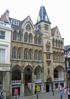 The red and yellow sandstone structure rises four stories with attics, featuring a square stair turret and multiple ornate bay windows along Eastgate Street.
