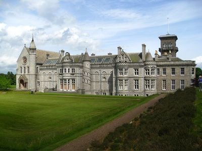 The stone mansion features symmetrical facades, decorative elements, grand ballroom, chapel, and an observatory within its 53,000-acre estate in Aberdeenshire.