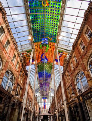 The Victoria Quarter section, designed by Frank Matcham in 1904, underwent restoration in 1990 when Brian Clarke created the glass roof over Queen Victoria Street.