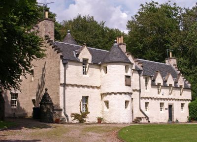 The house stands among formal gardens and stone buildings, featuring a design based on traditional Scottish tower houses from the seventeenth century.