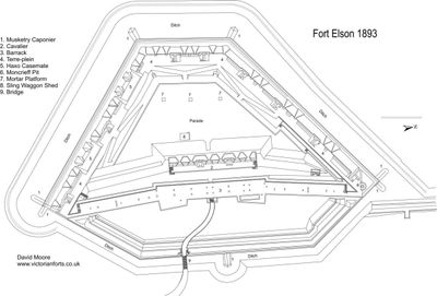 Fort Elson features an irregular hexagonal design with extensive defensive walls, ramparts, and a surrounding moat connected to the sea through a sluice system.