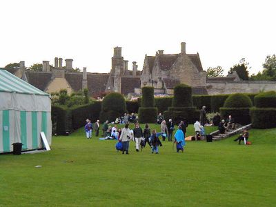 Hazelbury Manor is a Grade I listed manor house in Box with multiple living areas, halls and rooms distributed across three stories organized around a central courtyard. The property includes historic stone buildings, a coach house and stables situated within extensive grounds containing formal gardens and landscaped areas.