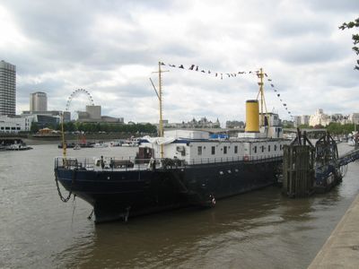 The vessel represents naval engineering advancement as one of three remaining Royal Navy warships from World War I, located near Blackfriars Bridge.