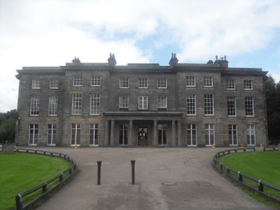 Haigh Hall is a manor house in Haigh, Greater Manchester, set on a gentle rise above the surrounding parkland. The building shows a symmetrical sandstone front with five stories, rectangular windows, and an entrance framed by Tuscan columns.