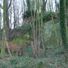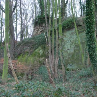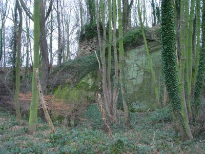 The castle ruins show substantial damage from past quarrying activities, with the remaining structure now integrated into the surrounding natural environment.
