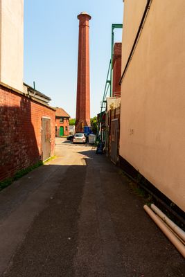 The octagonal brick and terracotta chimney stands near the Hydraulic Engine House, measuring several meters in height with distinctive period construction features.