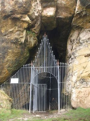 The entrance of King's Cave opens into a large chamber formed within sandstone cliffs, featuring multiple carved inscriptions along its walls.