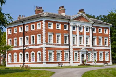 The Georgian mansion features symmetrical architecture with red brick walls, tall windows, and ornate stone decorations across its three-story structure.