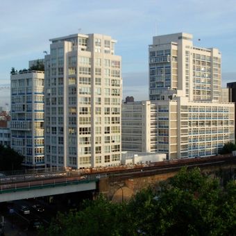 The complex functions as a residential community where people from across London now make their homes. The arrangement of the three connected structures creates a shared courtyard that serves as a gathering space for those living and moving through the area.