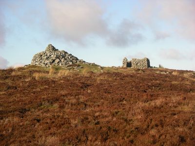 The summit contains remnants of an old building and a large raised stone cairn, reflecting the historical human presence in this mountainous region.
