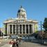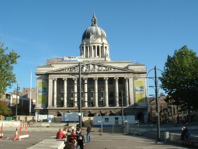 Nottingham Council House is a baroque revival town hall located in Old Market Square in Nottingham. It features a prominent central dome, classical stone details, and a symmetrical facade with substantial columns.