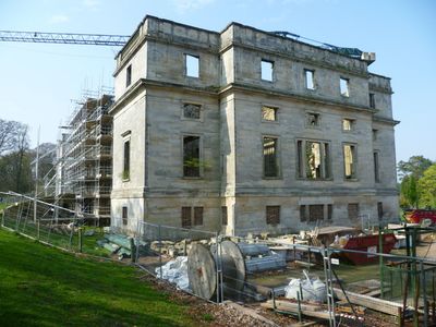 The Palladian mansion features a central hexastyle portico with grand columns and large windows across its symmetrical stone facade.