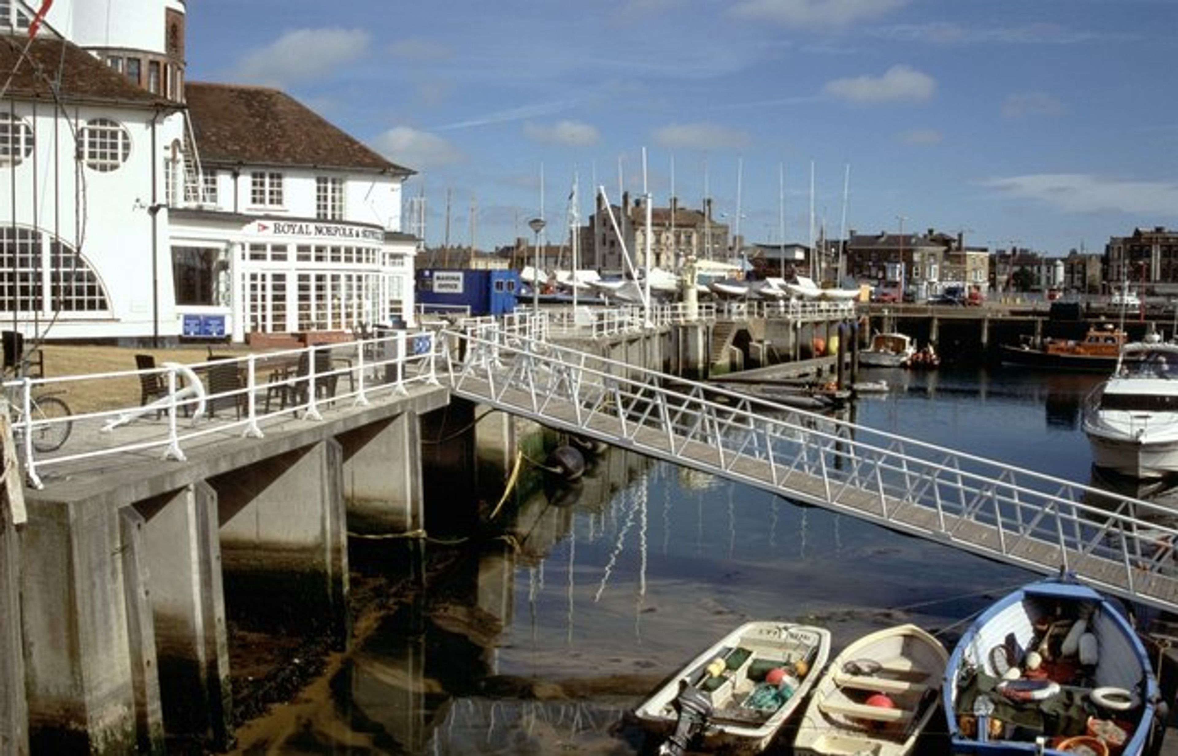 The Royal Norfolk and Suffolk Yacht Club maintains its own marina with a grand clubhouse overlooking the North Sea waters at Lowestoft harbor.