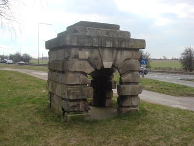 The limestone well house features arched entrances and stands next to the A1 road, marking a former spring location in South Yorkshire.
