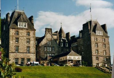 Atholl Palace Hotel stands on elevated grounds featuring Scottish Baronial architecture with turrets and towers surrounded by extensive landscaped gardens. The property offers various accommodation options ranging from traditional hotel rooms to self-catering cottages, along with a spa center providing treatment rooms and indoor swimming facilities.