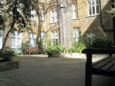 The site now contains paved public gardens with visible gravestones, located near Ireland Yard in the City of London's Farringdon Within ward.