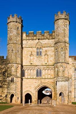 The remaining structures of Battle Abbey stand on Senlac Hill, featuring intact gates, walls, and living quarters from medieval construction periods.