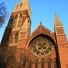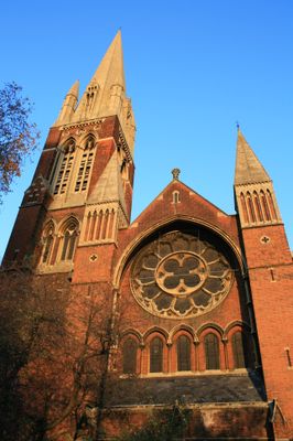 St Augustine's features nine bays across its nave, red brick construction, vaulted ceilings, and a 77-meter spire reaching toward the London sky.