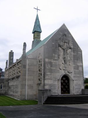 The building includes a large relief sculpture of the Trinity with Angels above the entrance, created by artist David John and integrated into the design.