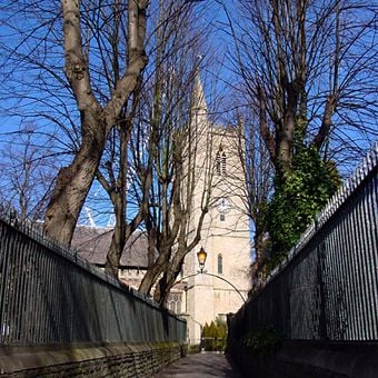The stone building features a prominent tower from 1374, wide aisles, and an 18th-century porch near Bristol's central bus station.