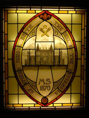 The red sandstone building features architectural elements inspired by Glasgow university buildings, with distinct Victorian educational design characteristics.