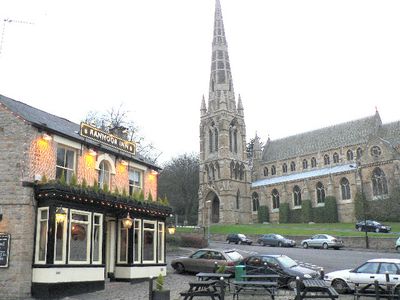 The stone church features a soaring 190-foot tower and spire, standing as the second tallest church spire in Sheffield with detailed architectural elements.