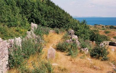 The remaining stone walls and foundations of St Andrew's Church stand above Church Ope Cove, displaying medieval architectural elements from different construction periods.