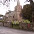 The stone church includes a nave, north aisle, timber south porch, lower chancel, and west tower topped with an octagonal slated spire.