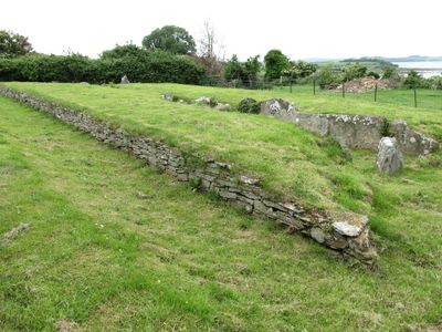 The court cairn extends 27 meters in length, featuring a stone corridor that connects to two galleries containing four burial chambers.