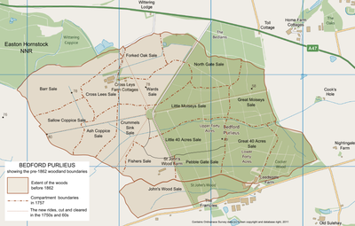 Bedford Purlieus encompasses 211 hectares of ancient woodland with varied soil types supporting numerous plant species and diverse wildlife populations.