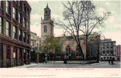 The stone structure exhibits English Baroque architecture with high walls and detailed masonry work, located at the intersection of Aldermanbury and Love Lane.