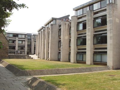 The Blue Boar Quadrangle stands as a modernist residential complex designed by Powell & Moya in 1968, featuring Portland stone facades and geometric forms that contrast with Oxford's traditional collegiate architecture.