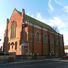 The red-brick church building features pointed arches, a tall window on its northern face, and detailed architectural elements in the English Gothic style.