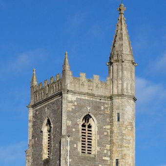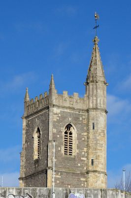 The remaining 15th-century tower of St Mary le Port stands among modern buildings in Castle Park, marking the former location of Mary le Port Street.
