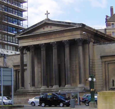 The Neoclassical church building stands prominently on Colston Avenue, featuring a hexastyle portico influenced by Greek architectural elements at its entrance.