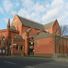 The red brick church features Gothic revival architecture with a long nave, transepts, and a chancel crowned by a pentagonal apse with lancet windows.