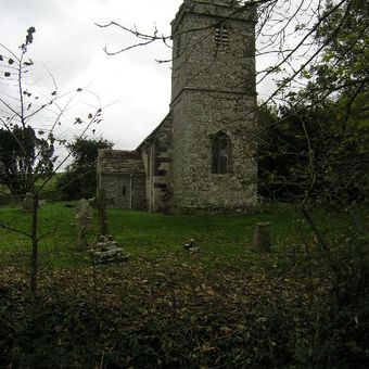 The stone church features a 12th-century flint chancel, a 14th-century nave, and a tower containing three bells from different periods.